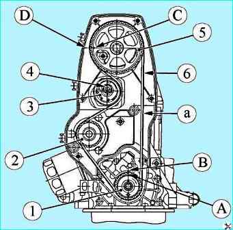 Детали привода газораспределительного механизма двигателя 11189: 1 - шкив коленчатого вала; 2 - шкив водяного насоса; 3 - автоматический натяжитель зубчатого ремня; 4 - гайка крепления автоматического натяжителя; 5 - шкив распределительного вала; 6 - ремень привода ГРМ; "А", "В", "С", "D" - метки установочные; (а) - ветвь ремня