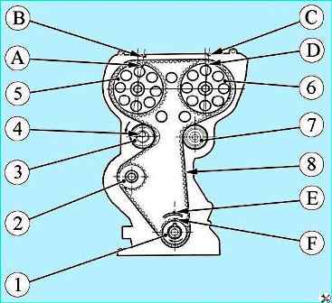 Детали привода газораспределительного механизма двигателя 21129: 1 - шкив коленчатого вала; 2 - шкив водяного насоса; 3 - автоматический натяжитель зубчатого ремня; 4 - болт крепления автоматического натяжителя; 5 - шкив распределительного вала выпускной; 6 распределительного вала впускной; 7 - ролик опорный; 8 - ремень привода ГРМ; "A", "B", "C", "D", "E", "F" - метки установочные