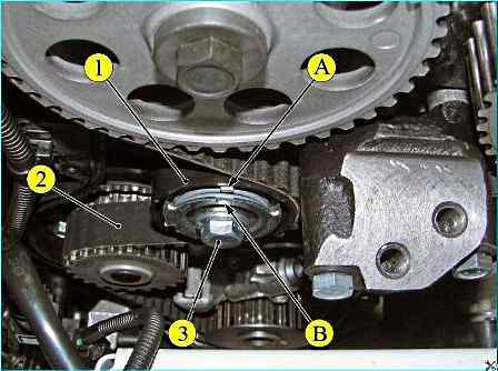 Натяжение ремня привода ГРМ: 1 - автоматический натяжитель зубчатого ремня; 2 - ремень привода ГРМ; 3 – болт крепления автоматического натяжителя; A, B - метки установочные