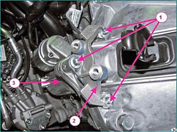 - головкой Torx E10 отворачиваем три болта 1 (рисунок 4), и снимаем кронштейн 2 крепления цилиндра сцепления (для автомобилей с механической КПП), снимаем стартер 3 не отсоединяя клемму и разъем жгутов проводов, подходящие к стартеру, и подвешиваем его на проволоку.