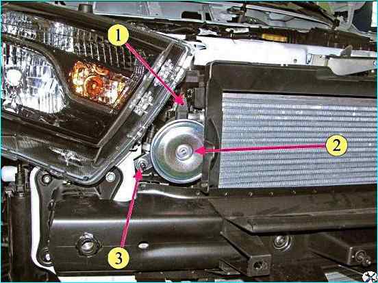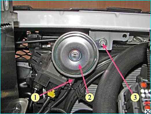 С помощью головки на 13 отворачиваем гайку 3 крепления прибора звукового сигнального к кузову автомобиля и снимаем прибор звуковой сигнальный.