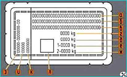 Модель и номер автомобиля, модель двигателя, весовые данные, номер для запасных частей, варианты исполнения и комплектации указаны в сводной табличке заводских данных, расположенной на правой стойке, внизу, в районе порога