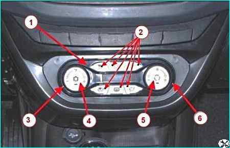 Блок управления климатической системой: 1 – блок САУКУ; 2 - кнопки распределения воздушных потоков; 3 - рукоятка регулировки температуры рециркуляции; 6 - рукоятка регулировки скорости воздуха в салоне; 4 - кнопка включения кондиционера; 5 - кнопка включения режима электровентилятора