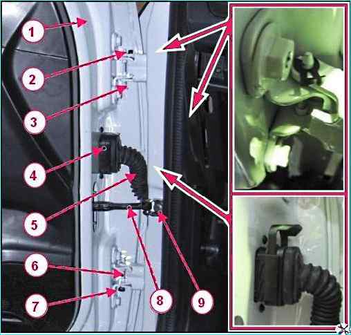 Снятие и установка передней двери: 1 - дверь передняя; 2, 7 - пластина стопорная оси петли двери; 3, 6 - ось звеньев петли; 4 - колодка жгута проводов двери; 5 - жгут проводов; 8 - ограничитель открывания двери; 9 – винт крепления ограничителя открывания двери к стойке боковины кузова