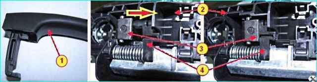 Установка ручки наружной привода замка двери: 1 - ручка наружная замка двери; 2 – корпус возвратного механизма наружной ручки; 3 – зацеп ручки наружной; 4 - рычаг возвратного механизма ручки наружной замка двери