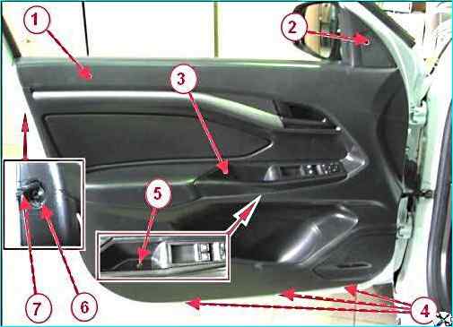 Крепление обивки левой передней двери: 1 - обивка двери; 2 - облицовка внутренняя наружного зеркала; 3 - ручка обивки передней двери левая; 4 - винты нижнего крепления обивки двери; 5 – винт крепления ручки; 6 - винт верхнего крепления обивки двери; 7 – заглушка