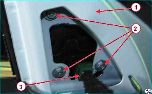 Крепление наружного зеркала: 1 - дверь передняя; 2 – винты крепления зеркала; 3 - колодка жгута проводов двери
