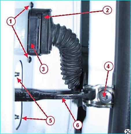 Крепление колодки жгута проводов и ограничителя открывания двери: 1 - винты крепления колодки жгута проводов двери; 2 - колодка жгута проводов заднего; 3 - колодка жгута проводов двери; 4 - винт крепления ограничителя открывания двери к передней стойки кузова; 5 - гайки крепления ограничителя открывания двери к двери; 6 - ограничитель открывания двери