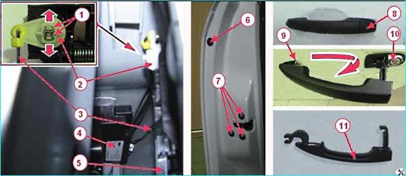 Замок передней двери и его привод: 1 - фиксаторы рычага выключателя замка; 2 - рычаг выключателя замка; 3 - тяга выключателя замка передней двери; 4 - замок передней двери; 5 – механизм ручки наружной замка передней двери; 6 - заглушка; 7 - винты крепления замка; 8 - накладка декоративная; 9 - заклепка крепления механизма наружной ручки к панели двери; 10 - выключатель замка передней двери; 11 - ручка наружная замка двери
