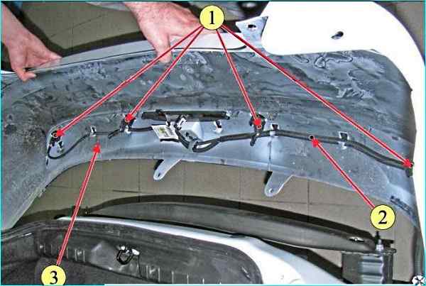 Вынимаем две кнопки крепления обивки и отворачиваем левую обивку 1, рисунок 3, арки и боковины.