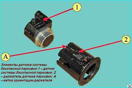 Элементы датчика системы безопасной парковки: 1 - датчик системы безопасной парковки; 2 - держатель датчика парковки; А - метка ориентации держателя
