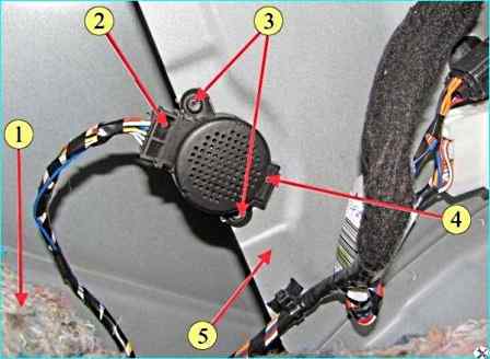 Блок управления и сигнализации системы безопасной парковки: 1 - обивка арки и боковины левая; 2 - колодка жгута проводов заднего к блоку управления и сигнализации системы безопасной парковки; 3 – винт самонарезающий; 4 – блок управления и сигнализации системы безопасной парковки, 5 - панель боковины левая