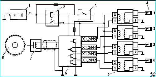 Контроллер коммутирует на массу цепь первичной обмотки катушки зажигания, выдающей высокое напряжение на свечи зажигания соответствующих цилиндров: