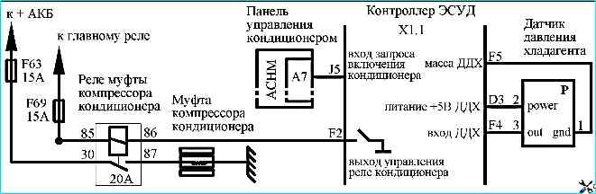 Сигнал запроса включения кондиционера поступает на контакт "Х1.1/J5" контроллера ЭСУД.