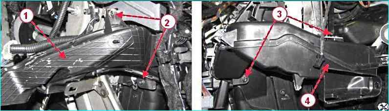 Головкой Torx 20 откручиваем винты 2 и 3, рисунок 3, крепления левого 1 и правого 4 воздуховодов обогрева ног, снимаем воздуховоды.