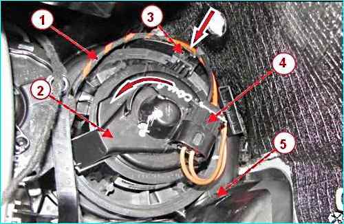 Отсоединяем от вентилятора 2, рисунок 5, блока 5 отопления, вентиляции и кондиционирования колодку 4 жгута 1 проводов.