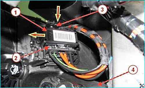 Отсоединяем колодку 2, рисунок 6, жгута проводов от регулятора частоты вращения вентилятора 1.