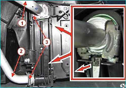 Нажимаем на фиксатор 3 вентилятора и одновременно, повернув корпус вентилятора против часовой стрелки, извлекаем вентилятор из корпуса блока системы вентиляции, отопления и кондиционирования.