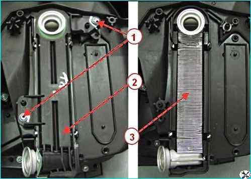 Головкой Torx 20 отворачиваем два винта 1, рисунок 9, крепления крышки 2 радиатора 3 отопителя, снимаем крышку.