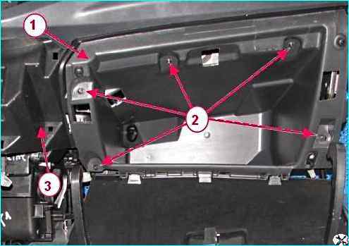Головкой Torx 20 откручиваем пять винтов крепления вещевого ящика, рисунок 10, снимаем вещевой ящик, отсоединив от концевого выключателя крышки вещевого ящика колодку жгута проводов панели приборов.