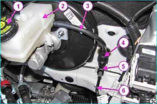Снятие гидропривода сцепления: 1 пробка; 2 - бачок жидкости тормозов; 3 - трубка; 4 - цилиндр сцепления главный; 5 - скоба фиксатора; 6 - трубка гидропривода сцепления