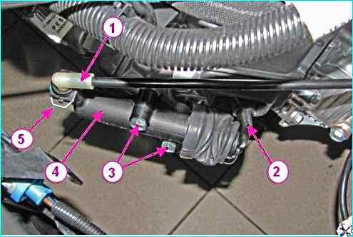 Снятие гидропривода сцепления: 1 - трубка гидропривода сцепления; 2 – вилка выключения сцепления; 3 – болт крепления; 4 - цилиндр сцепления рабочий; 5 – скоба фиксатора