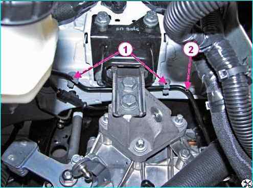 Снятие гидропривода сцепления: 1 - скоба крепления; 2 - трубка гидропривода сцепления