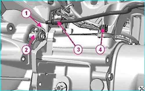 Снятие гидропривода сцепления: 1 - скоба фиксатора; 2 - цилиндр сцепления рабочий; 3 - трубка гидропривода сцепления; 4 - скоба крепления