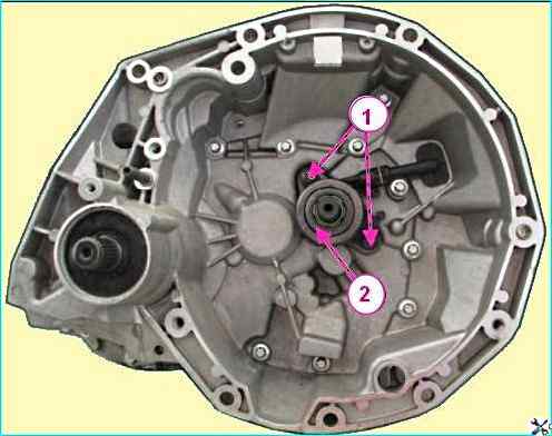 Снятие муфты выключения сцепления: 1 – болты крепления; 2 - муфта выключения сцепления в сборе с рабочим цилиндром сцепления