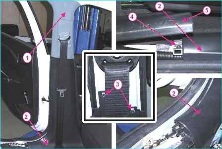 Снимаем обивку 1, рисунок 1, средней стойки кузова верхнюю.
