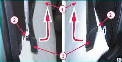 С помощью плоской отвертки отводим с каждой из сторон край наружного 3, рисунок 4, горизонтального уплотнителя опускного стекла в сторону от двери 1, для выхода фиксатора 2 уплотнителя из отверстия в панели двери, затем, потянув вверх, снимаем уплотнитель с панели двери.