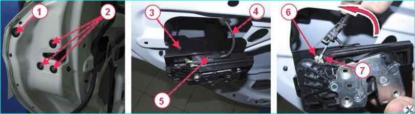 Отсоединяем держатель 5 обоймы 4, а затем и наконечник 7 троса наружной ручки двери от замка, снимаем замок в сборе с тросом внутренней ручки привода замка.