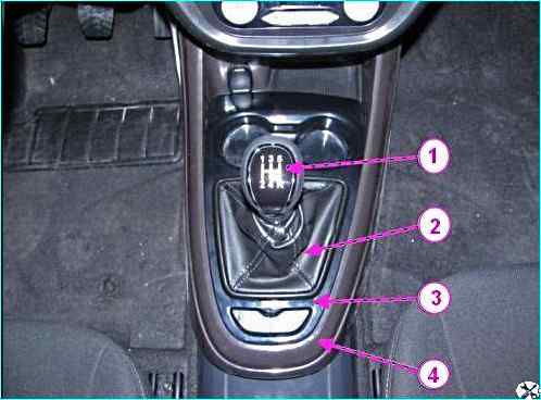 Снятие привода управления механизмом переключения передач: 1 - рукоятка рычага переключения передач; 2 – чехол; 3 – накладка облицовки туннеля пола; 4 – облицовка туннеля пола передняя