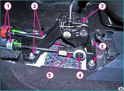 Снятие привода управления механизмом переключения передач: 1 - фиксатор крепления оболочки троса; 2 - гайка крепления; 3 - привод управления механизмом переключения передач; 4 – кнопка фиксатора крепления наконечника троса; 5 - наконечник троса