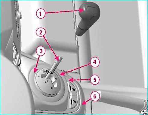 Снятие привода управления механизмом переключения передач: 1 - рукоятка рычага переключения передач; 2 – рычага переключения передач; 3 - накладка привода управления механизмом переключения передач; 4 – вставка облицовки туннеля пола; 5 – накладка облицовки туннеля пола; 6 - облицовка туннеля пола передняя