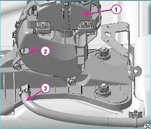 Снятие привода управления механизмом переключения передач: 1 - привод управления механизмом переключения передач; 2 - разъем; 3 - жгут проводов задний дополнительный правый