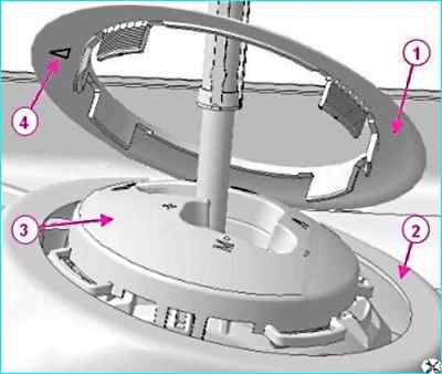 Установка привода управления механизмом переключения передач: 1 - накладка привода управления механизмом переключения передач; 2 - вставка облицовки туннеля пола; 3 - привод управления механизмом переключения передач; 4 - стрелка