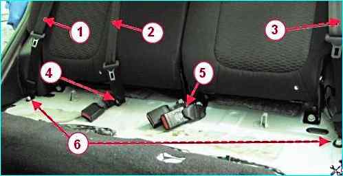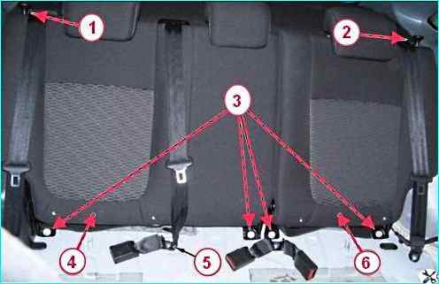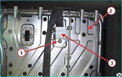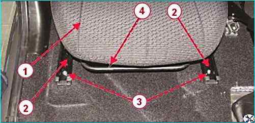 Отворачиваем болты 1 крепления кронштейнов правой 3 спинки заднего сиденья, снимаем спинку.