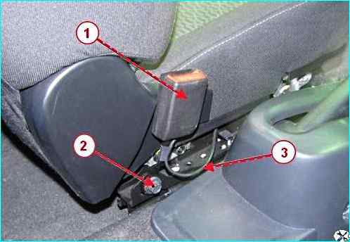 Головкой на 14 отворачиваем болт 4, рисунок 12, крепления нижней точки среднего 2 ремня безопасности и замка правого ремня безопасности.