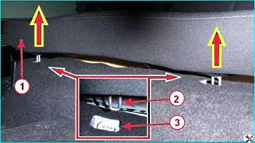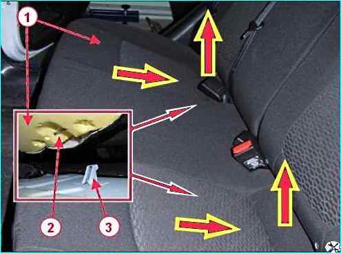 Берем руками за передний край подушки 1, рисунок 3, заднего сиденья и тянем вверх до выхода петли 2 каркаса подушки из отверстия фиксатора 3 на кузове.