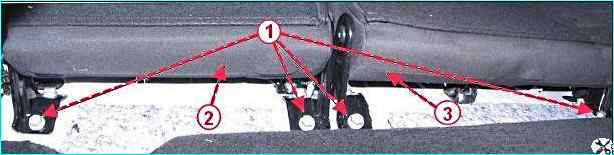 Взяться за подушку 1, рисунок 4, заднего сиденья, сдвигаем ее назад, в сторону багажника, затем приподнимаем задний край подушки для вывода петли 2 каркаса подушки из захвата 3 на кузове.