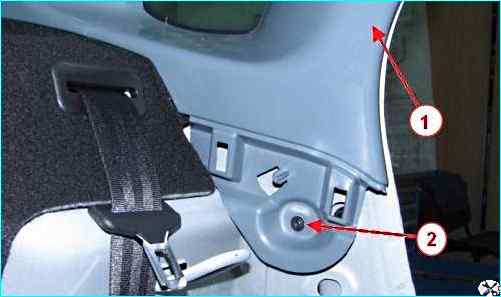 Извлекаем пластмассовые кнопки 2, рисунок 8, крепления обивки 1 полки багажника.