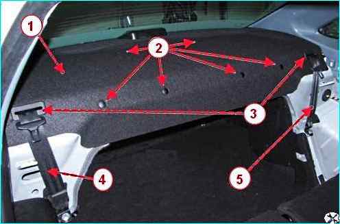 С помощью плоской отвертки извлекаем из отверстий в обивке полки прокладки 3 ремней безопасности правого 4 и левого 5.