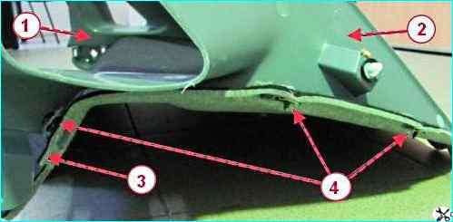 Головкой Torx Т20 отворачиваем для каждой из сторон по три самонарезающих винта 4, рисунок 9, крепления обивки 1 и 2 окна боковины к обивке 3 полки, разъединяем детали.