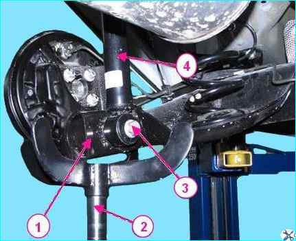 Снятие амортизатора задней подвески: 1 - рычаг задней подвески; 2 - стойка трансмиссионная; 3 - болт крепления амортизатора; 4 - амортизатор задней подвески