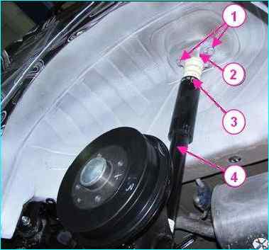 Снятие амортизатора задней подвески: 1 - болт крепления верхней опоры; 2 - опора верхняя в сборе; 3 – буфер хода сжатия с защитным кожухом в сборе; 4 - амортизатор задней подвески