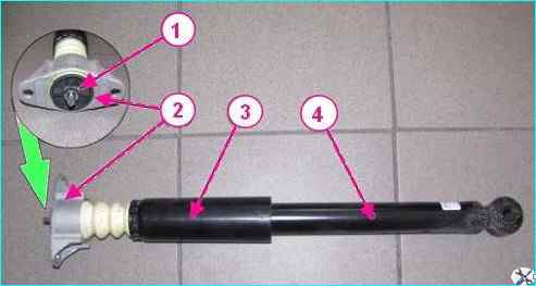 Разборка амортизатора задней подвески: 1 – гайка крепления верхней опоры к штоку амортизатора; 2 - опора верхняя в сборе; 3 - буфер хода сжатия с защитным кожухом в сборе; 4 - амортизатор задней подвески