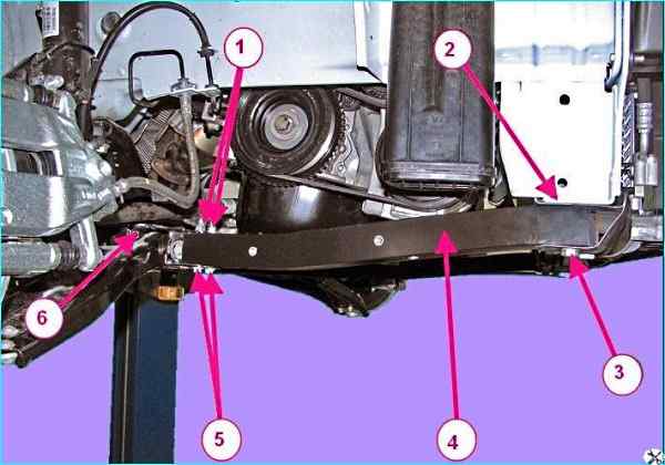 Отворачиваем две гайки 1, рисунок 1, болтов 5 крепления лонжерона к подрамнику 6 и извлекаем болты (понадобится ключ накидной на 13 и головка на 10).