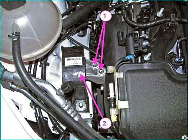 Отворачиваем и извлекаем два болта 1, рисунок 3, крепления двигателя к правой опоре 2 подвески силового агрегата (применяем головку Torx E12).
