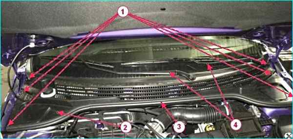 Головкой Torx T20 отворачиваем шесть самонарезающих винтов 1 крепления накладки рамы ветрового окна, снимаем накладку.